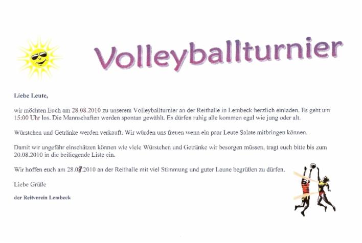 Der Reitverein Lembeck läd am letzten Ferienwochenende zu einem Volleyballturnier ein. Listen hängen an der Reithalle "Erler Heide" aus oder Ihr meldet Euch über den Kontakt unseres Reitvereins hier auf der Homepage an.